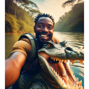 I have used Adobe Express to create an AI image of a man on a crocodile taking a selfie.